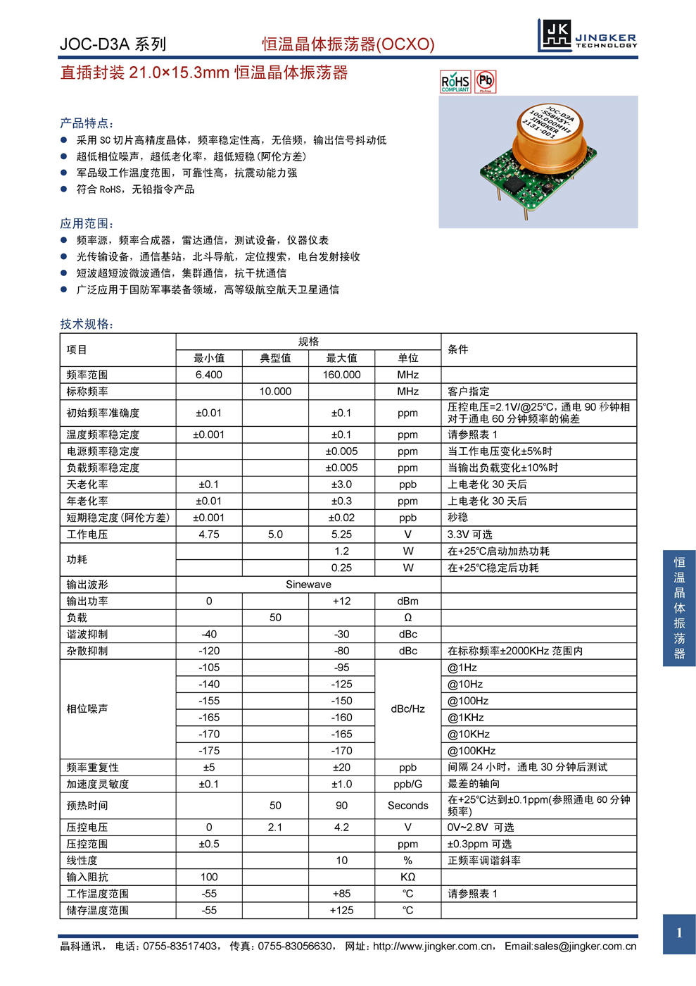 产品特点:采用SC切片高精度晶体,频率稳定性高,无倍频,输出信号抖动低;超低相位噪声,超低老化率,超低短稳(阿伦方差);军品级工作温度范围,可靠性高,抗震动能力强;符合RoHS,无铅指令产品。应用范围:频率源,频率合成器,雷达通信,测试设备,仪器仪表;光传输设备,通信基站,北斗导航,定位搜索,电台发射接收;短波超短波微波通信,集群通信,抗干扰通信;广泛应用于国防军事装备领域,高等级航空航天卫星通信。