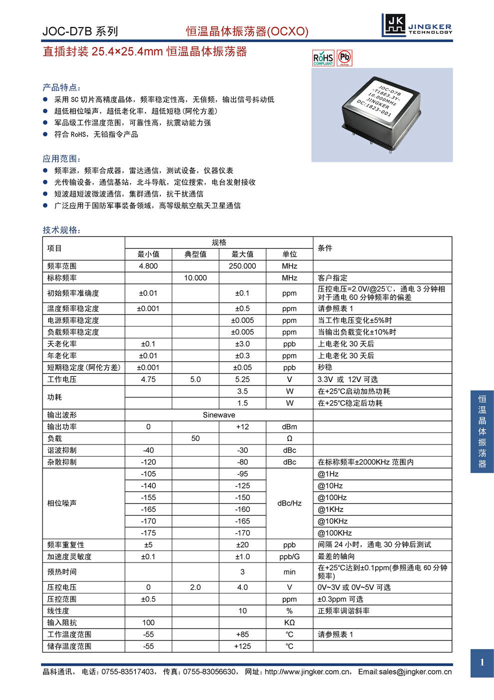 产品特点:采用SC切片高精度晶体,频率稳定性高,无倍频,输出信号抖动低;超低相位噪声,超低老化率,超低短稳(阿伦方差);军品级工作温度范围,可靠性高,抗震动能力强;符合RoHS,无铅指令产品。应用范围:频率源,频率合成器,雷达通信,测试设备,仪器仪表;光传输设备,通信基站,北斗导航,定位搜索,电台发射接收;短波超短波微波通信,集群通信,抗干扰通信;广泛应用于国防军事装备领域,高等级航空航天卫星通信。
